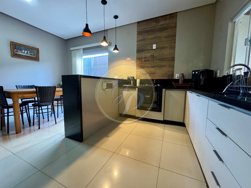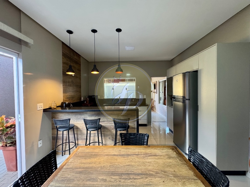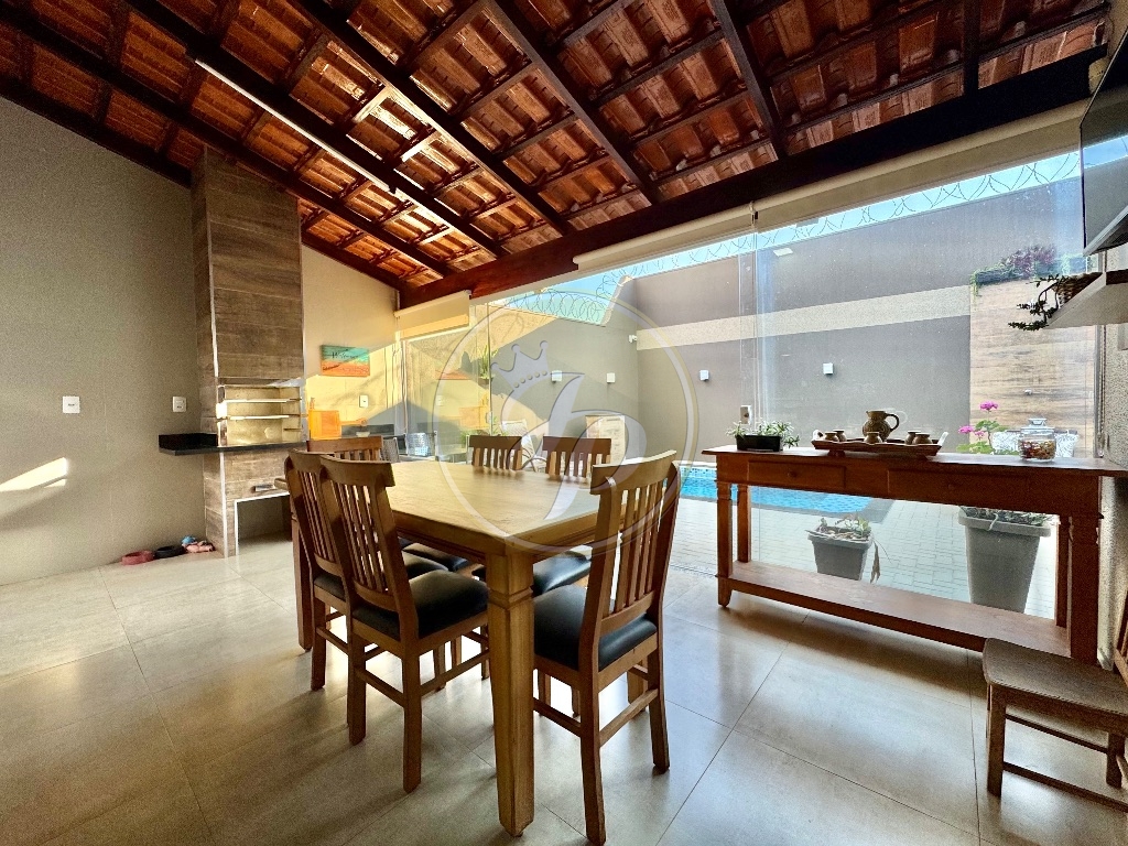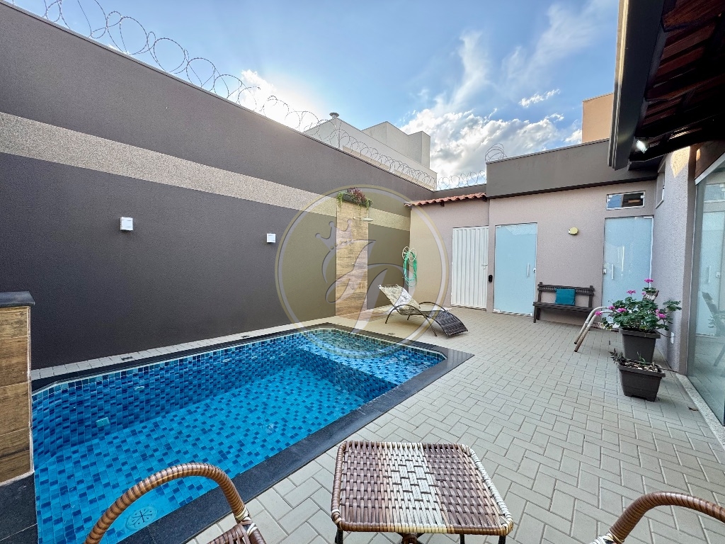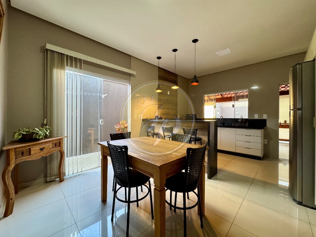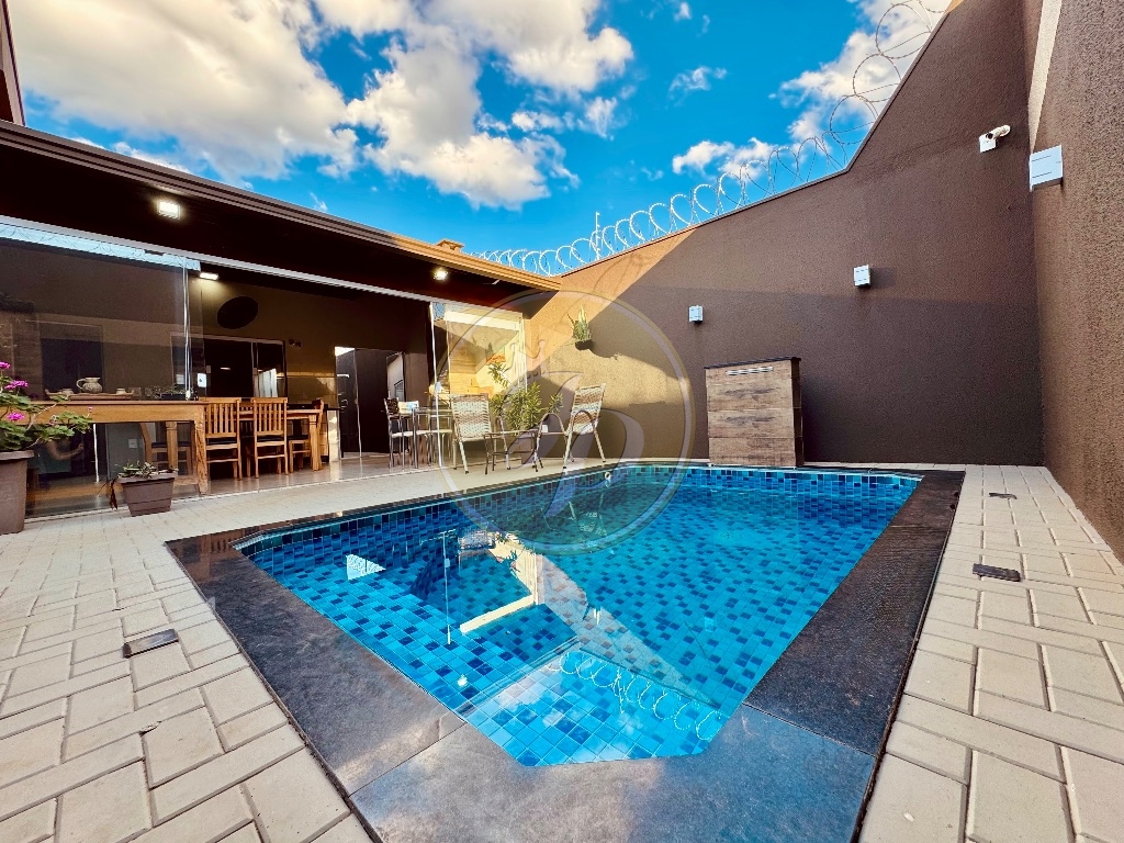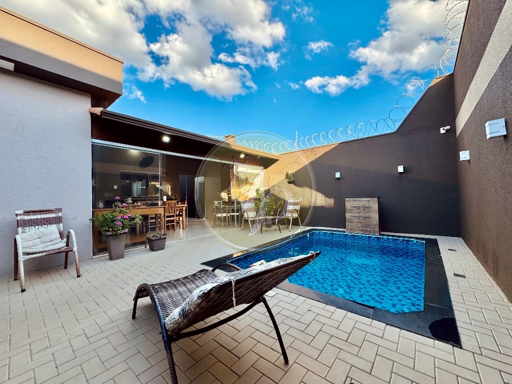 3 quartos sendo 2 suítes com armários, sala de TV, sala de jantar, cozinha planejada, banheiro social, lavanderia, espaço gourmet com churrasqueira, piscina com cascata, e garagem para 2 carros.